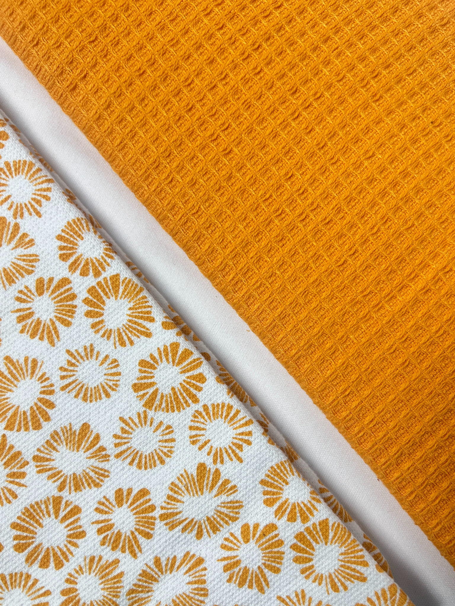 Saffron Sunbloom Hand Towel Set features one warm golden-yellow towel with a dense, uniform waffle-grid texture and a coordinating ivory companion showcased with a whimsical scattering of sun-inspired floral motifs.