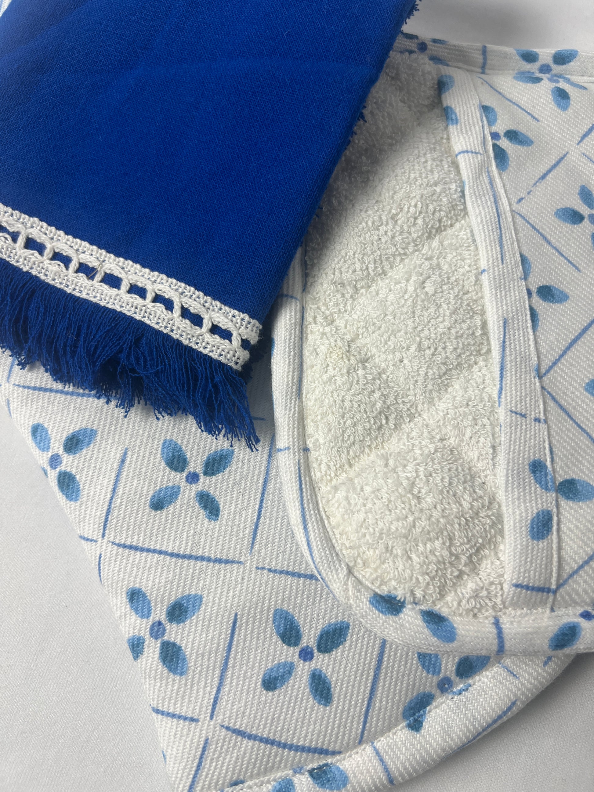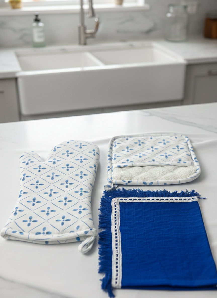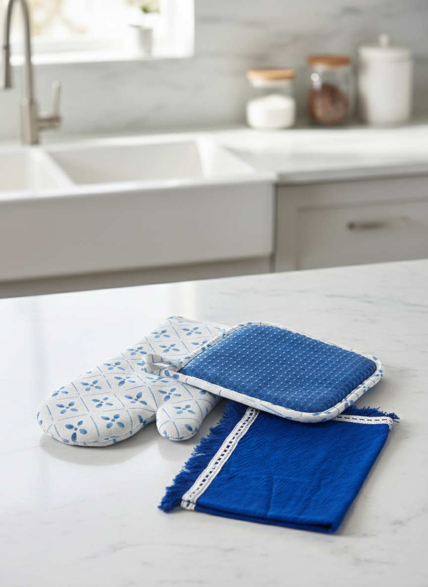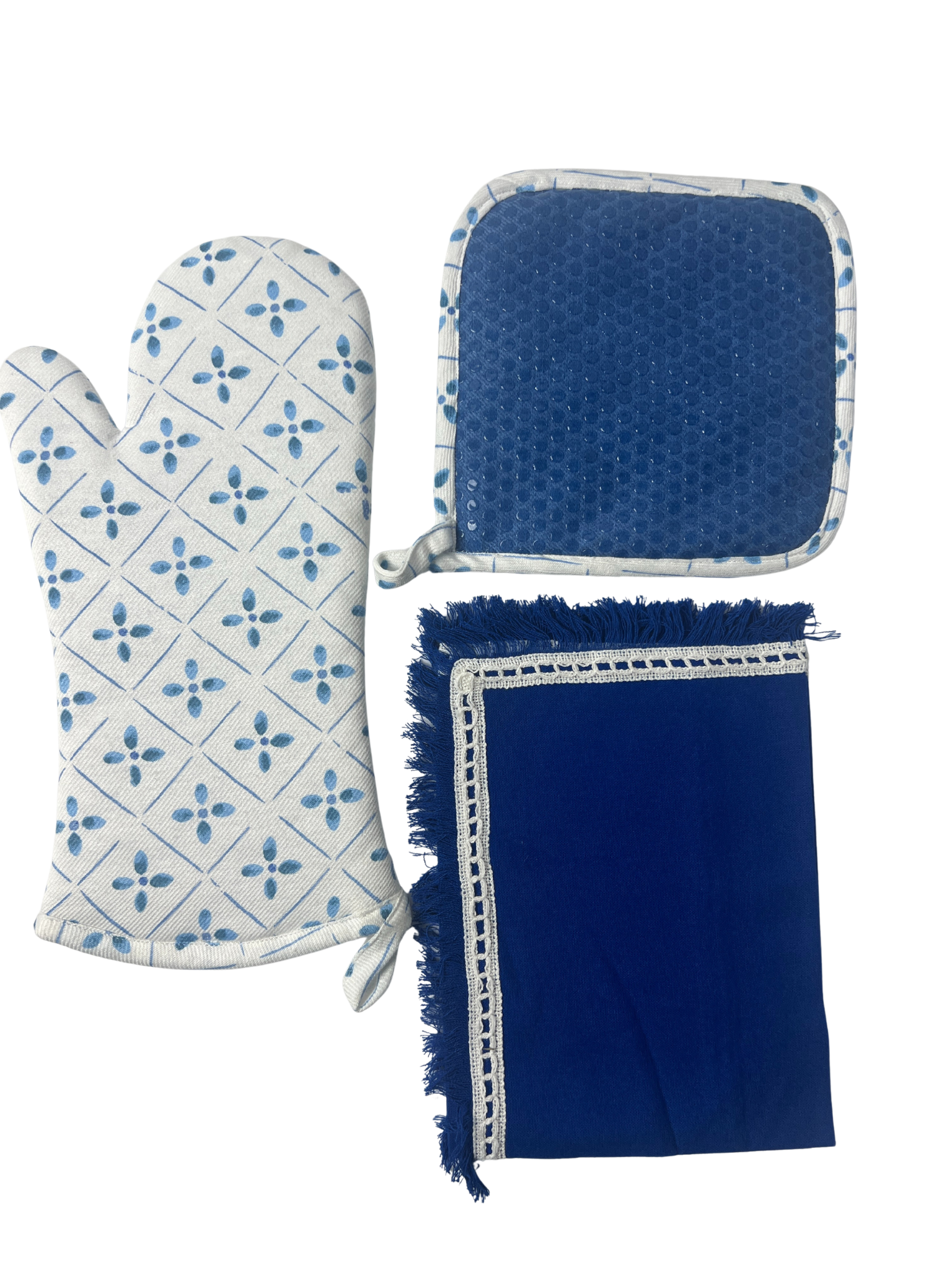 - Dimensions: Set of Three (One 14"x19" Fringed Kitchen Towel, One Quilted Oven Mitt with Silicon Grip, and One Quilted Pot Holder).