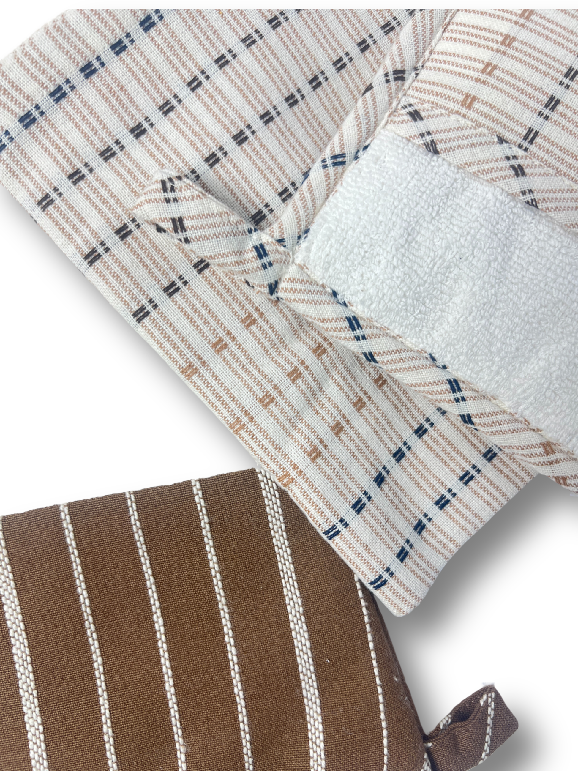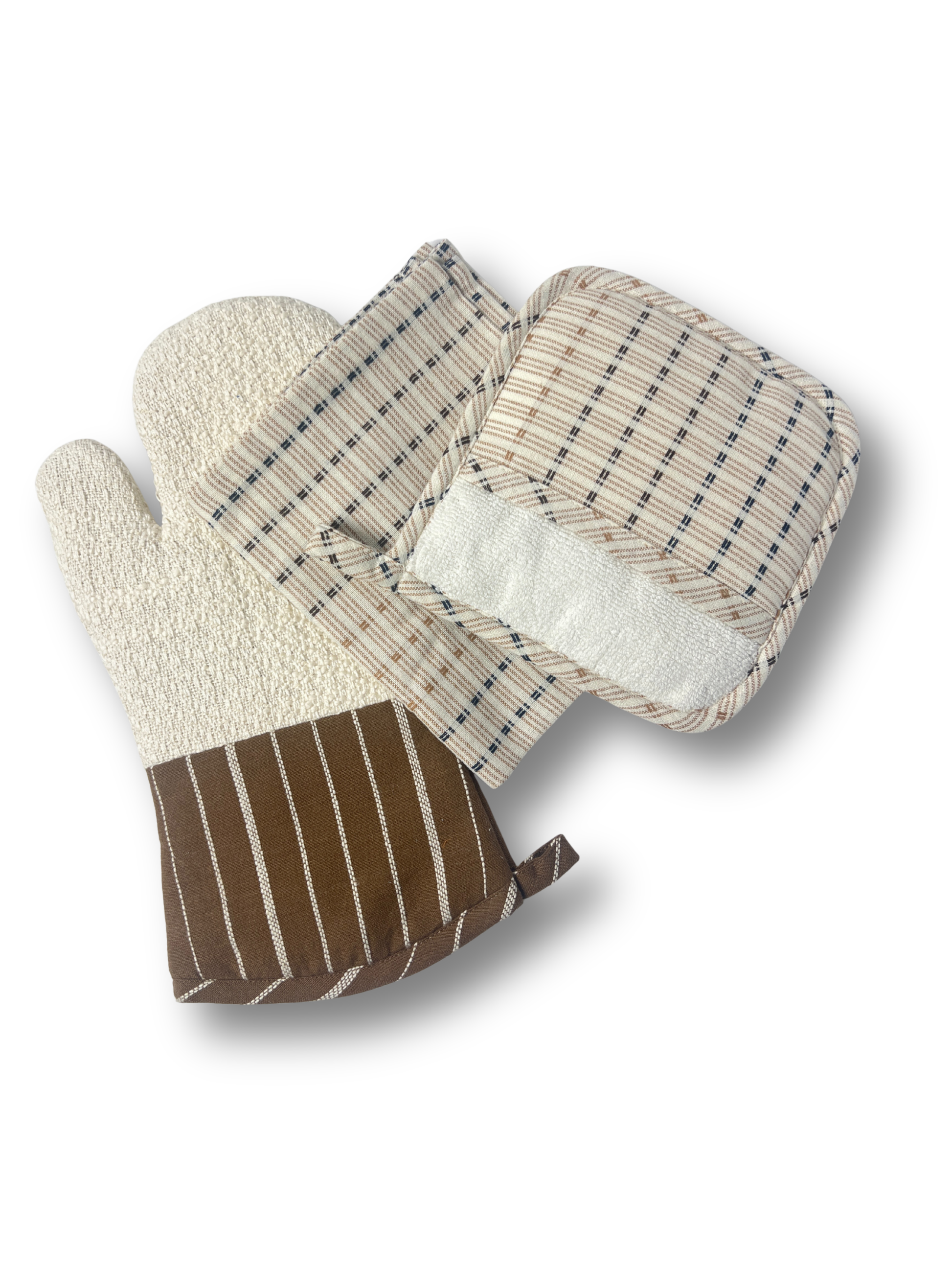 - Dimensions: Set of Three (One 14"x19" Kitchen Towel, One Full-Sized Quilted Oven Mitt, and One Quilted Pot Holder).