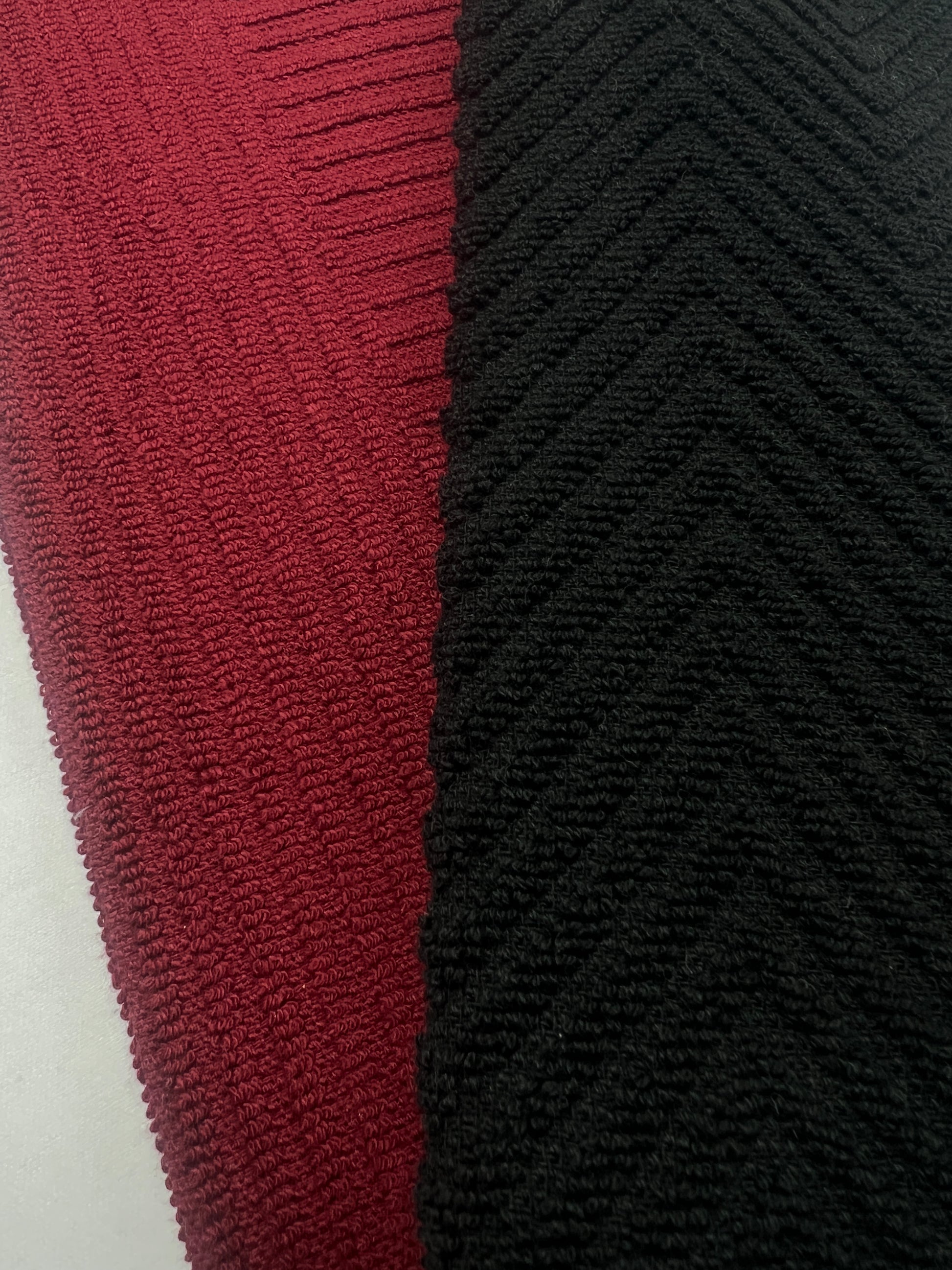 Ruby & Onyx Chevron Hand Towel Set features one deep ruby-red towel with a dense, linear ribbed texture and a coordinating onyx companion showcased in a tactile, tufted chevron pattern. Crafted from high-quality, 100% premium cotton, each piece offers a durable, thick-textured surface.